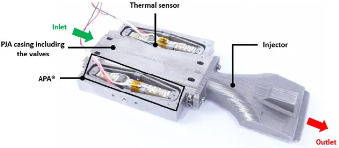 A PJA is a fast-acting piezo valve composed of two APA400MML actuators. As per the specification of the Jet Propulsion Institute, the Pla25 actuators were required to power the PJAs at full on/off at 200Hz, with switching times of 1ms. Given the capacitance of over 6µF of each APA400MML, this very short response time requires a current of 2.5A, utilizing the full potential of the Pla25.